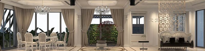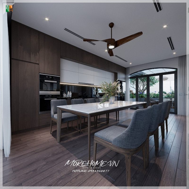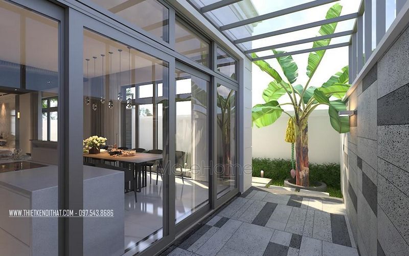 Mẫu cửa kính hiện đại làm tăng độ tiện nghi và sang trọng cho không gian phòng ăn biệt thự, nhà phố.