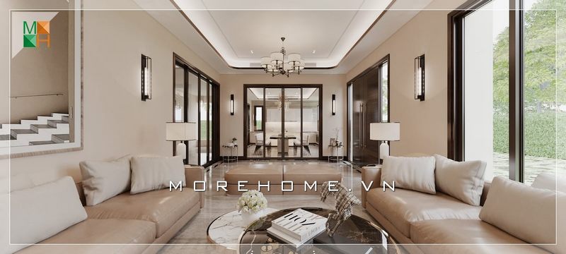 Cửa kính 4 cánh thông thoáng giúp ánh sáng và bầu không khí tự nhiên bên ngoài dễ dàng lan tỏa khắp không gian