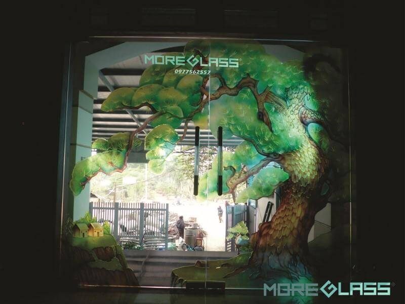 Ấn tượng với mẫu thiết kế cửa kính cường lực điêu khắc cây đại thụ, với ý nghĩa mang lại sự vững chắc, trường tồn cho gia chủ