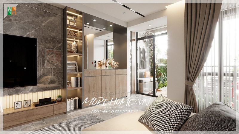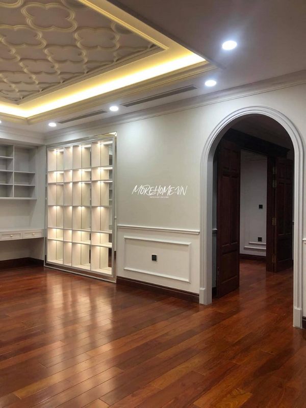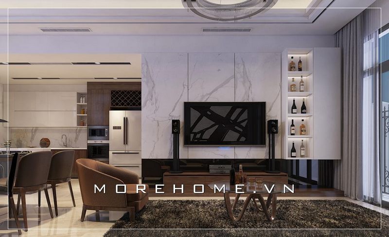 Nội thất phòng khách gồm kệ tivi tân cổ điển và kệ trang trí 2 bên bằng gỗ tự nhiên do Morehome sản xuất và lắp đặt