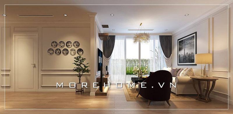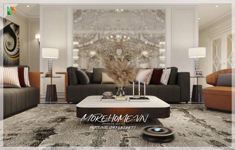 Thiết kế nội thất phòng khách chung cư cao cấp phong cách tân cổ điển sang trọng với từng đường nét, họa tiết vô cùng độc đáo