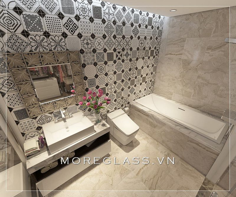 Mẫu thiết kế nội thất phòng tắm cao cấp, nổi bật với gạch ốp tường hoa văn độc đáo