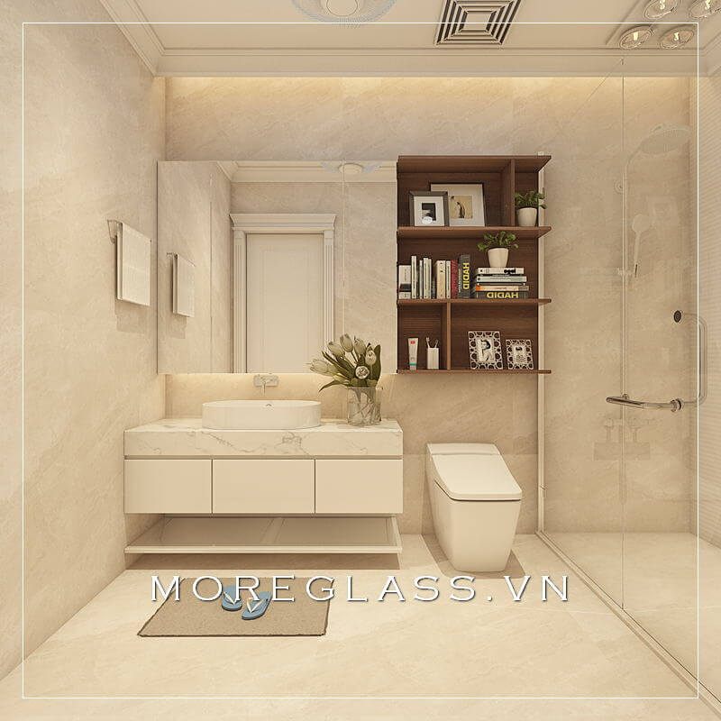 Sử dụng vách tắm kính cường lực tạo cho không gian phòng tắm thêm rộng và sạch sẽ.