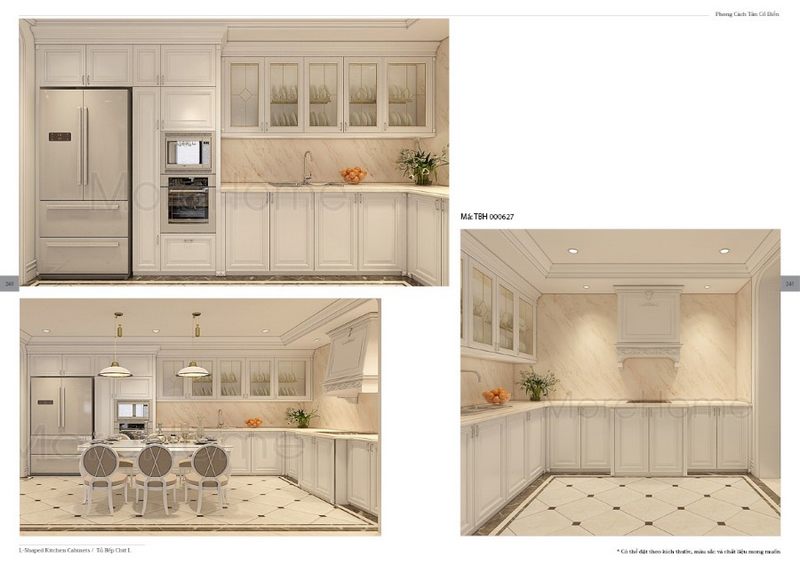 Phòng bếp tân cổ điển màu trắng trẻ trung và sáng sủa sẽ giúp tạo ra một không gian thoải mái và dễ chịu khi bạn nấu nướng hay nội trợ.