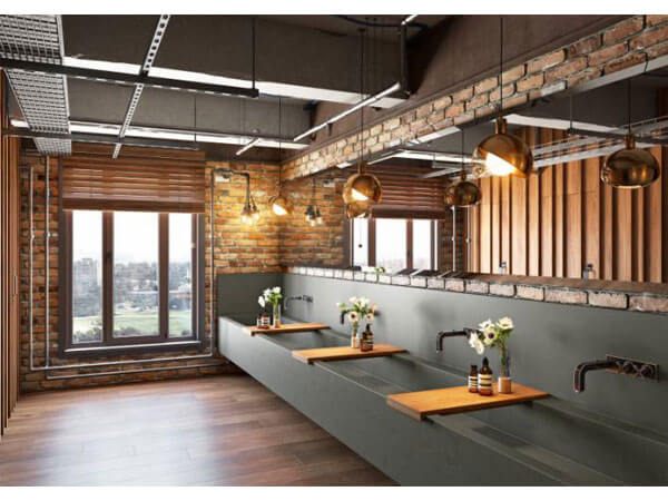 Chậu rửa lavabo được làm từ đá nhân tạo với những ánh đèn vàng để trang trí, tạo nên không gian sang trọng và lung linh.